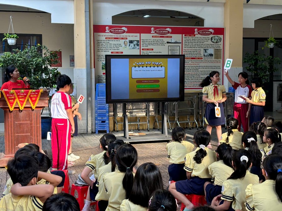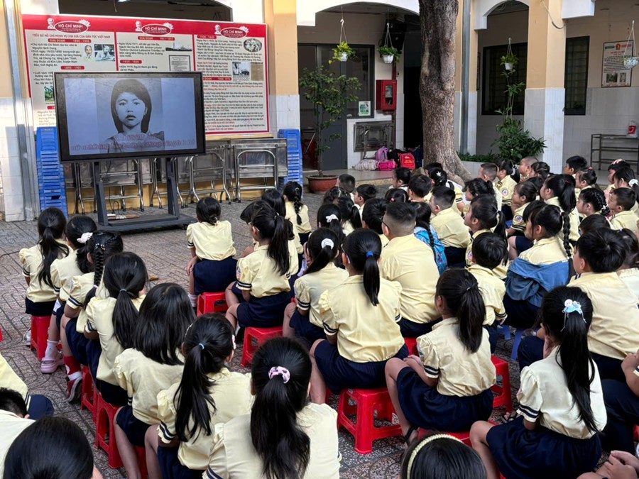 Để giúp các em hiểu rõ hơn về lý tưởng và ý chí kiên cường của chị, nhà trường đã tổ chức cho học sinh xem một đoạn phim tư liệu ngắn. Những hình ảnh chân thực kết hợp cùng giai điệu da diết của bài hát về chị Võ Thị Sáu đã chạm đến trái tim của thầy cô và học sinh toàn trường, mang lại một không gian tĩnh lặng đầy xúc động.